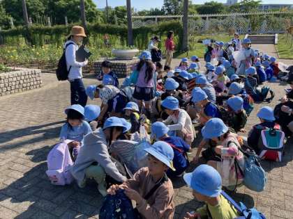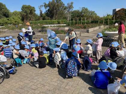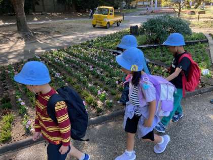 バラ園を通り、いよいよオリエンテーリングです。どんぐりを入れる袋を持ち、グループでなかよくゴールをめざします。