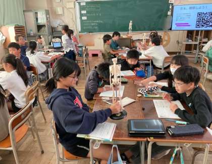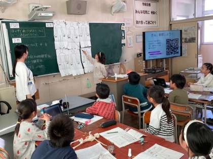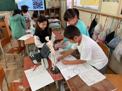 4年生が理科「ヒトと体のつくりと運動」を学習しています。今日は、自分の体を触ったり、骨の模型や映像などの資料を活用したりして、体の中で曲げられるところを調べました。