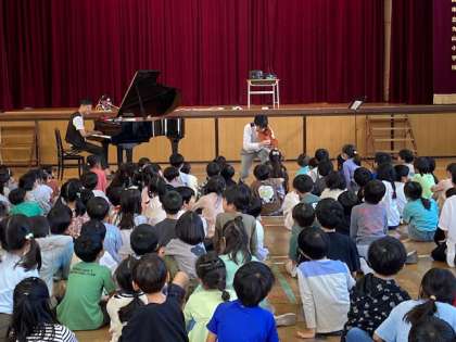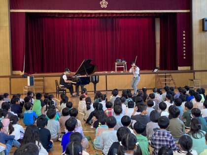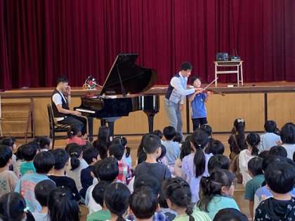 1年生から4年生が講堂に集まり、音楽鑑賞会を行いました。ピアノとバイオリンの演奏で、音を楽しむことができました。バイオリン演奏の体験もあり、とても盛り上がった音楽鑑賞会となりました。