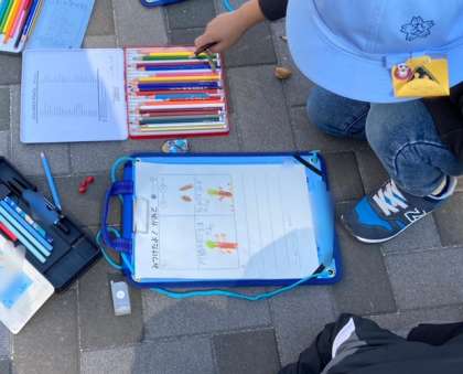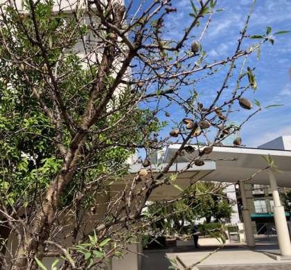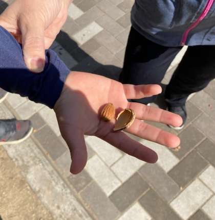 1年生が生活科の学習で秋みつけをしました。校内の木々や草花の色を見て、カードに記録しました。秋見つけをしていると、体育館前にアーモンドの木があることを発見しました。