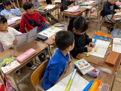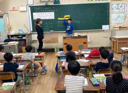 1年生の算数は、9+4の計算の仕方を考えました。ブロックを使ったり、絵を描いたりして考える子、10のかたまりを作って考え子など、一緒懸命に考えました。