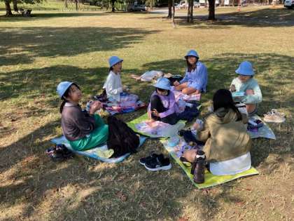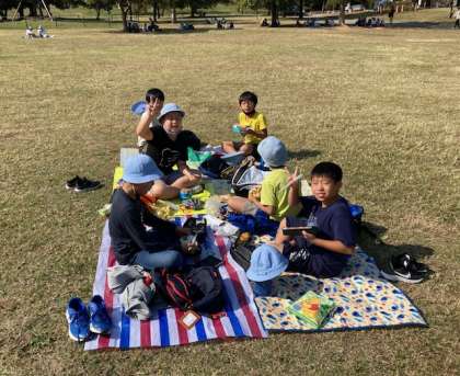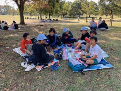お楽しみのお弁当タイムです。広々とした公園で友だちと仲よくお弁当を食べました。
