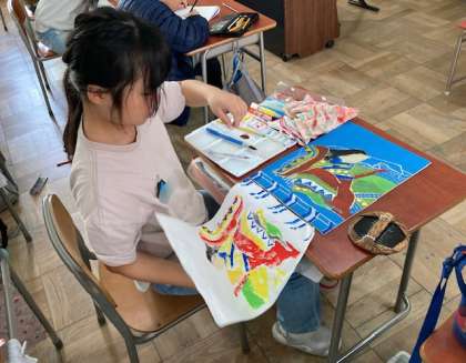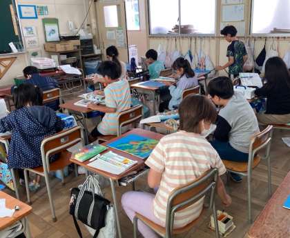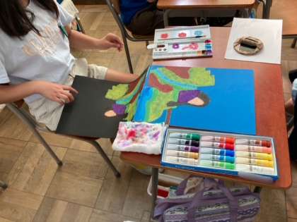 4年生が一版多色版画をしています。木版に下書きをして版を彫ります。水彩絵の具を版の上に一色塗ります。絵の具が乾かないうちに、刷り紙を重ねバランでこすります。これを繰り返して完成させます。でできあがりが楽しみです。
