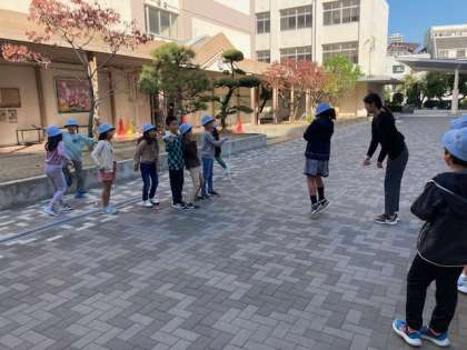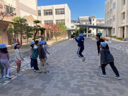 6日からなわとび週間が始まります。大縄跳びは、3分間で跳べる目標を決め、目標達成に向けて練習していきます。早速、3年生が花の広場で大縄跳びに挑戦していました。