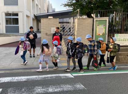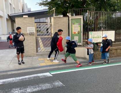 ラグビーのレッドハリケーンズの選手4人が本校に来ました。5年生で出前授業をしてもらいます。登校時に正門と西門に選手が立ち、あいさつ運動をしてくれました。タックルをする児童もいて、和やかな登校になりました。