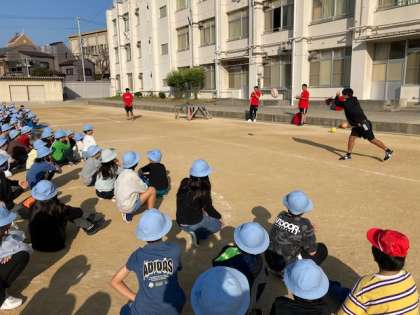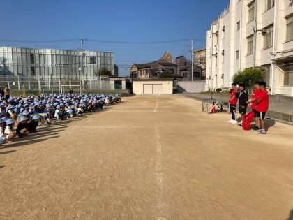 今日の児童集会はレッドハリケーンズの選手の紹介とラグビーのデモンストレーションをしてもらいました。パス、タックル、ラインアウトを見せてもらいました。児童からは「ラグビーにはどんなけががありますか」と質問があり、丁寧に答えてくれました。