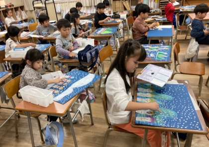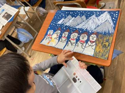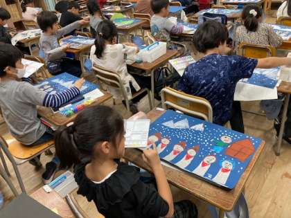 2年生が、かさこ地蔵の絵画を制作しています。英字新聞で地蔵さんを作り、画用紙に貼りました。指に白の絵の具をつけ降ってくる雪を表しました。