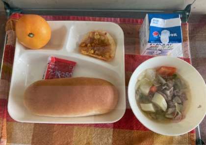 献立は、豚肉と野菜のスープ、変わりピザ、みかん、コッペパン、いちごジャム、牛乳です。