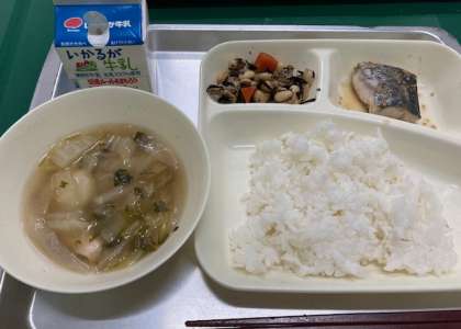 献立は、さごしのごまじょうゆかけ、うすくず汁、大豆の煮もの、ご飯、牛乳です。