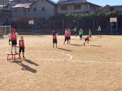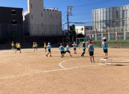 4年生が体育でポートボールをしています。ボールを持っていない人がパスをもらえるように動くかがポイントです。チームで話し合って練習しています。
