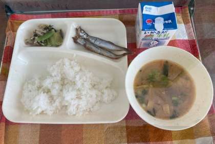 献立は、焼きししゃも、みそ汁、こまつなのいためもの、ご飯、牛乳です。
