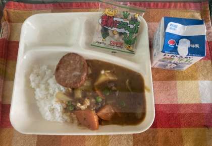 献立は、ハンバーグカレーライス、カリフラワーのピクルス、豆こんぶ、牛乳です。