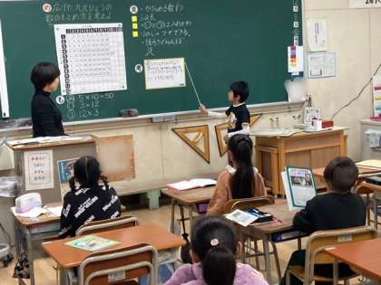 2年生が算数「九九を作ろう」を学習しました。かけ算のきまりや性質を用いて、2位数と1位数のかけ算の答えの求め方を考えました。自分の考えをしっかりと説明できました。