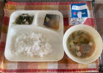献立は、さばのみぞれかけ、すまし汁、こまつなの煮びたし、ご飯、牛乳です。