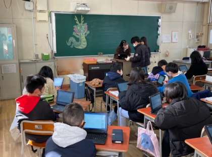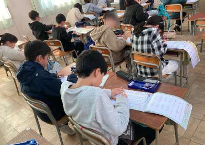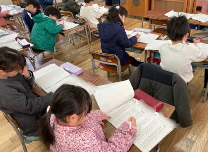 タブレット端末を使って作文を書いている学級、漢字ドリルに取り組む学級、冬休みの課題の答え合わせをする学級など、早速、学習に取り組んでいました。