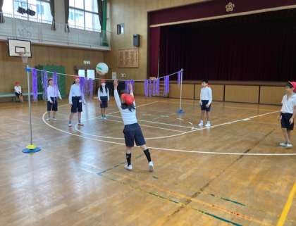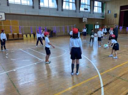 4年生が体育でキャッチバレーボールをしています。サーブレシーブ、トス、アタックのかわりにボールをキャッチします。3回キャッチして相手コートに返します。また、サーブも投げます。ゲームを重なっていくうちにルールを変更します。