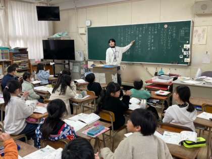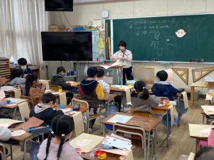 2年生が紙版画「けんばんハーモニカをふくぼく、わたし」をしています。今日は顔、鼻、目、まゆ毛、耳、髪の毛を作りました。また、となりのクラスでは国語「なかまになることば」を学習しました。