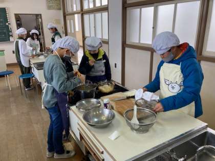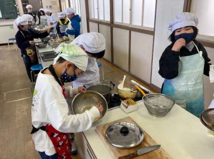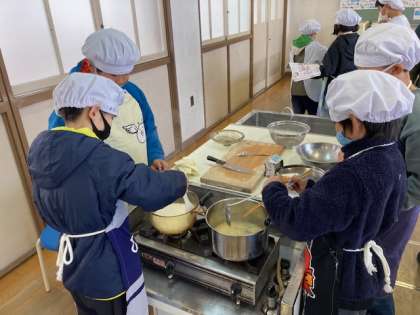 5年生が調理実習をしました。ごはんを炊いて、みそ汁を作りました。ごはんは透明の容器で炊きましたので、加熱後のごはんの様子が観察できました。みそ汁は煮干しで出汁をとり、具を切って入れ味噌で味付けをしました。みんなで協力して美味しくできあがりました。