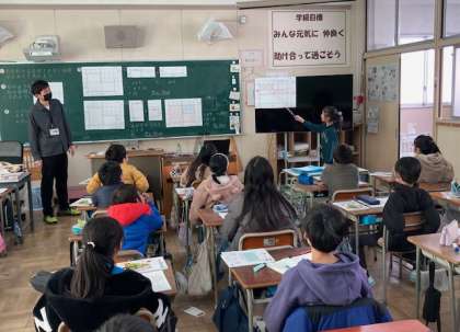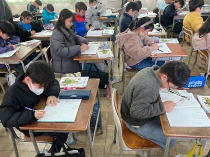 4年生が算数「広さの表し方を考えよう」を学習しています。今日は、L字型の面積の求め方を考えました。L字型の図形を線で分けたり、大きい長方形から小さい長方形を引いたりして面積を求めました。色々と求め方を考えました。