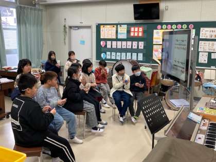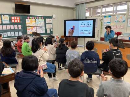 カスタネットの音が聞こえてきたので、音楽室をのぞくと、4年生が動画を見ながらカスタネットの演奏をしていました。非常にアップテンポの曲ですが、リズムに合わせてカスタネットをたたいていました。