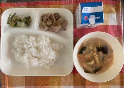 献立は、豚肉のごまだれ焼き、みそ汁、きくなとはくさいのおひたし、ご飯、牛乳です。