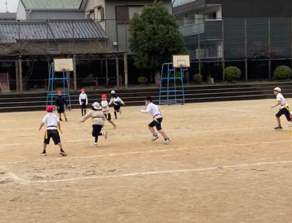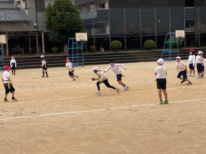 4年生がタグラグビーをしています。タックルの代わりに相手のタグを取って守ります。ボール持って走り、相手をかわしたりパスをしたりしながらゴールに向かってトライするゲームです。ぶつかることがなく安全です。
