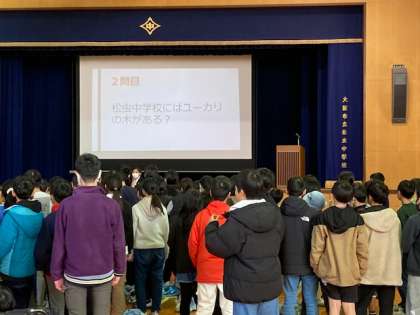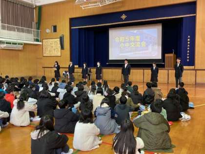 6年生が小中交流会で松虫中学校へ行きました。金塚小学校6年生と一緒に、松虫中学校生徒会から学校生活の説明を受けました。また、クイズやジャンケン列車をして金塚小学校の皆さんと交流しました。