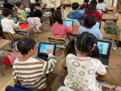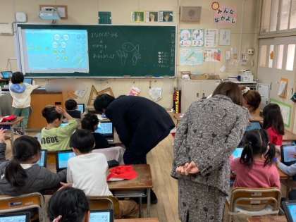 1年生がタブレット端末を使って、ビスケットをしました。魚や海藻の絵を描き、それを動かしました。ICT支援員さんから丁寧に教えてもらいました。子どもたちは大変喜んでタブレット端末を操作しました。