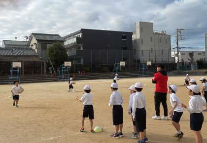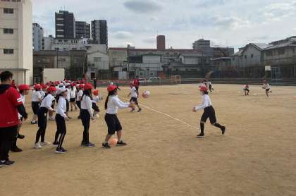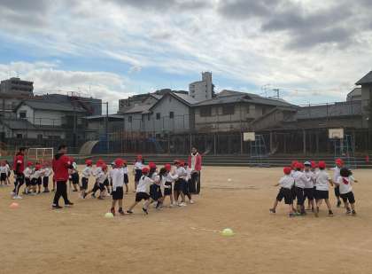 レッドハリケーンズの選手をゲストティチャーにお招きしました。1・2・4年生が1時間ずつ、ラグビーボールを使って選手と一緒に体を動かしました。