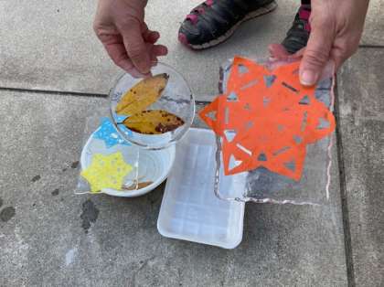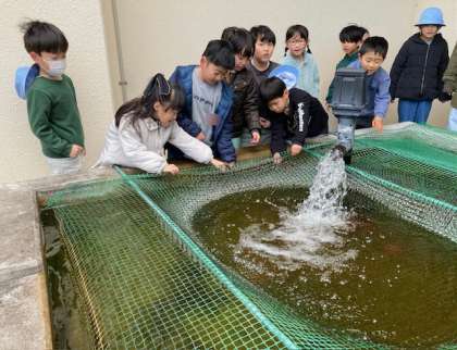 池の水面に緑色の網をしています。その網の表面が氷柱みたいに凍っていました。また、トレーに水を入れおりがみや葉っぱを浮かべて置いていたら、しっかりと凍っていました。真冬の寒さです。防寒対策をして体調管理をお願いします。