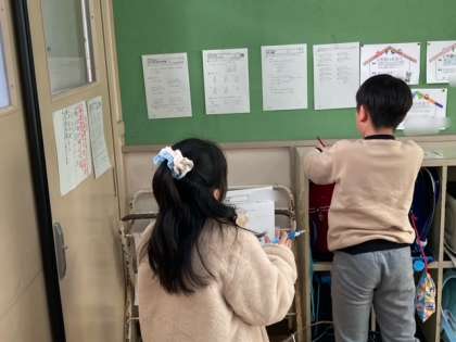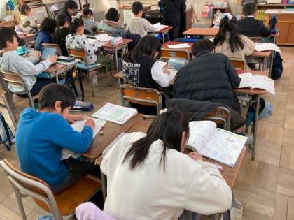 3年生が明日の単元テストに向けて、プリントで復習したり、デジタルドリルをしたりしました。掲示板にはっているプリントの解答を自分で採点してまちがいをなおしました。