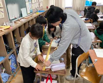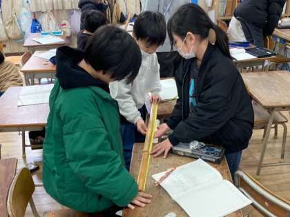? 2年生は、「長いものの長さのたんい」を学習しています。今日は両手を広げた長さをはかりやすいような長いものさしがあるのかを考えました。両手を広げた長さに切ったテープを30cmのものさしではかりました。