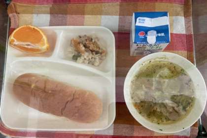 献立は、おしむぎのグラタン、豚肉と野菜のスープ、デコポン、おさつパン、牛乳です。