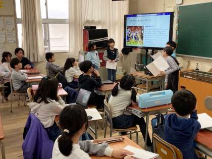 3年生の学習参観は「外国のことをしようかいしよう」です。各班で調べた世界の国のことを発表ノートで作成して、プレゼンテーションをしました。