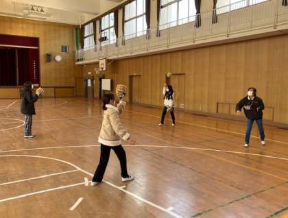 学級ごとにグローブを1日使えるようにまわしています。主に休み時間に、体育館でキャッチボールをしています。初めてグローブをはめる子、キャッチボールの楽しさを味わった子、先生と上手にキャッチボールできる子など、さまざまです。