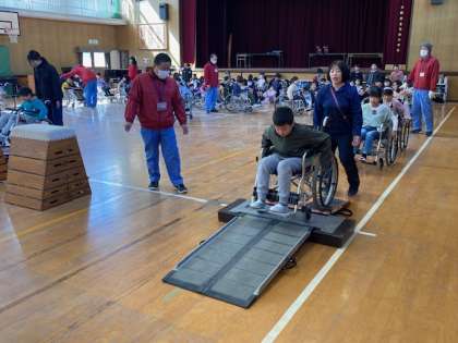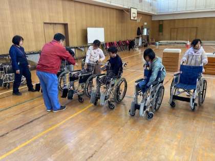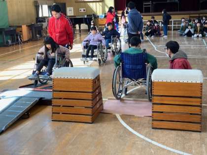 3年生が車いす体験をしました。体育館で車椅子の操作の仕方を教えてもらい、その後、体育館に作られたコースを車いすにに乗って操作しました。真っ直ぐに行ったり、曲がったり、坂道をのぼりおりたり、段差を越えたりしました。