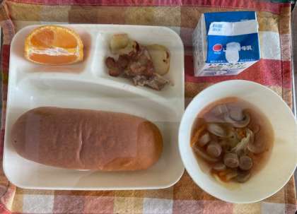 献立は、鶏肉とじゃがいものガーリック焼き、ウィンナーとてぼ豆のスープ、デコポン、黒糖パン、牛乳です。