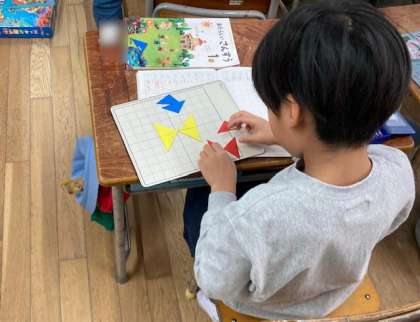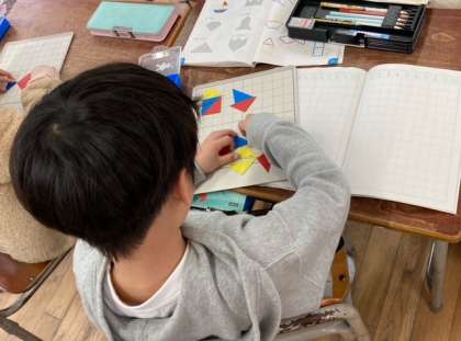 1年生の算数はかたちづくりです。三角形の色板を3枚、4枚使って色々な形を作りました。