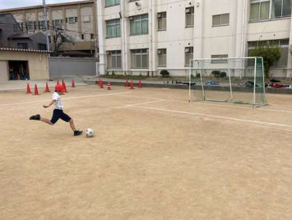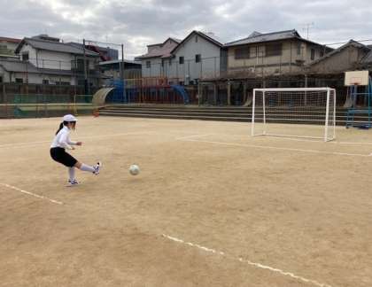 4年生がサッカーの学習をしました。今日はシュート練習をしました。ゴールキーパーがいないサッカーゴールに向かって、力強くシュートをしました。