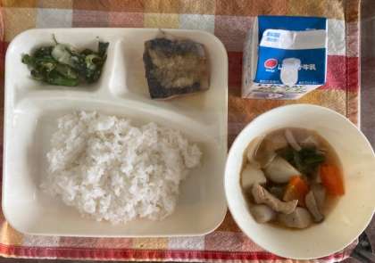 献立は、さごしのおろしじょうゆかけ、さといもと野菜の含め煮、なのはなのおひたし、ご飯、牛乳です。