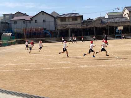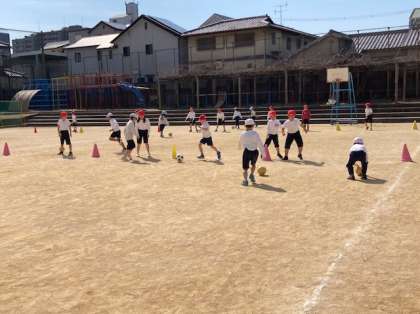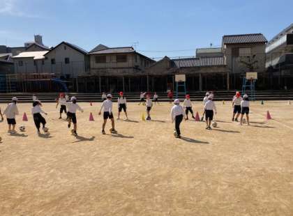 2年生の体育は、ボールゲームです。はじめにウォーミングアップとして、運動場を走りました。自分のペースで長く走れるようになっています。その後、ボールをドリブルしながら、コーンの間にシュートをします。しかし、友だちが守っているので簡単には入りませんが、楽しくボールゲームができました。