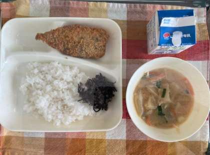 献立は、いわしのフライ、みそ汁、牛ひじきそぼろ、ご飯、牛乳です。