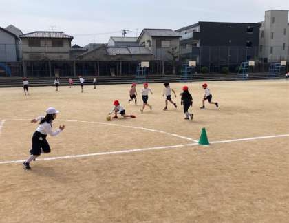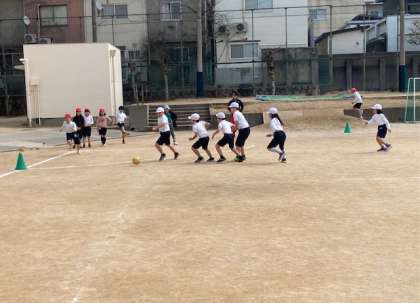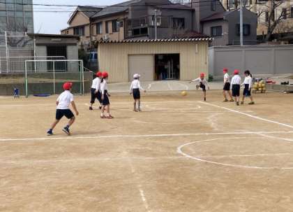 3年生の体育はキックベースボールです。守備側はキックしたボールを取り、その後ろに守備側のメンバーが一列に並びます。守備側が並ぶまでに走ったポイントによって1点、2点、3点となります。楽しくできるルールを考えてキックベースをしています。