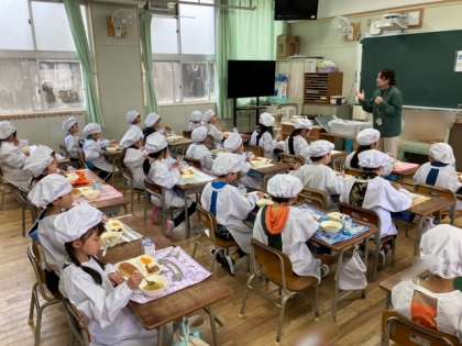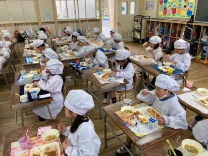 献立は、じゃがいものミートグラタン、レタスのスープ、みかんの缶詰、黒糖パン、牛乳です。1年生にとって、小学校での初めての給食です。担任の先生から給食の食べ方(三角食べ)を教えてもらいました。おいしくいただきました。