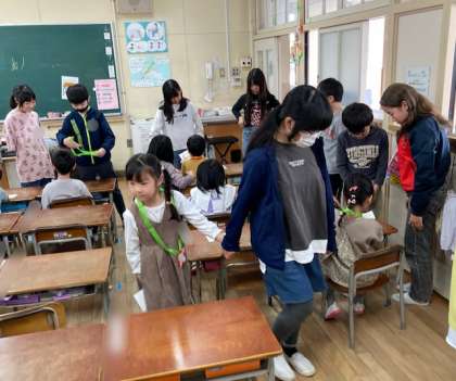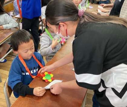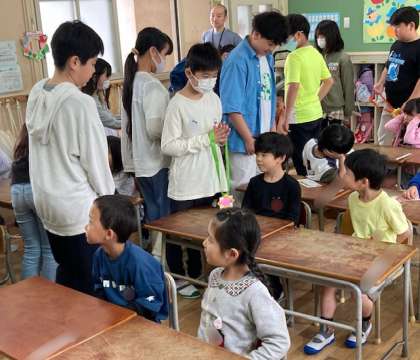 1年生の入学を祝う会を児童会が企画して行いました。まず、6年生が作ったメダルを1年生に渡しました。1年生は自分の名前を書いたカードを渡しました。初めて6年生に会うのでドキドキしましたが、6年生はとても優しく頼りになります。6年生と1年生が手をつないで、いよいよ入場です。