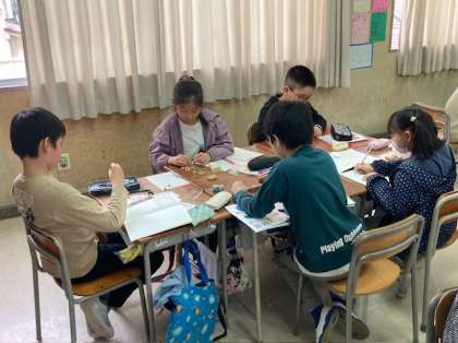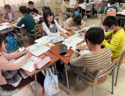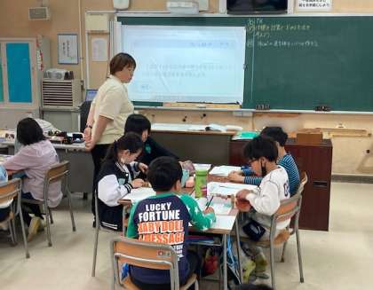 5年では教科担任制を実施しています。算数担当の3組の担任と体積を求める方法を考えました。1?の立方体24個を使って24?の直方体をいくつか作りました。