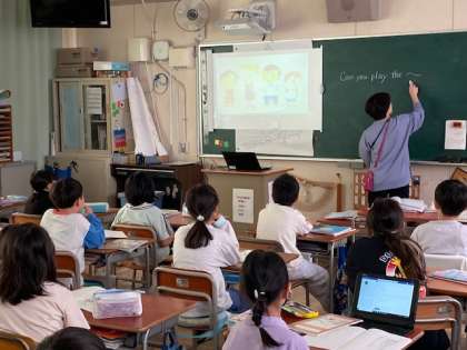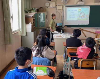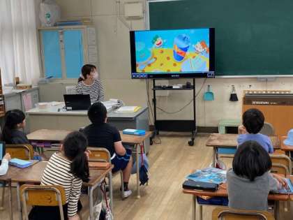 今日の朝はイングリッシュタイムです。週2回Dreamを使ったモジュール学習を行っています。内容への興味を高めらために先生と児童がやり取りをしています。
