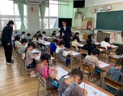 1年生の学習参観は、国語「あいうえおのうた」です。ひらがなを書く学習をした後、口の形に気をつけて「あいうえおのうた」を言いました。たくさんの保護者の方に参観していただき、子どもたちはいつもよりがんばっていました。
