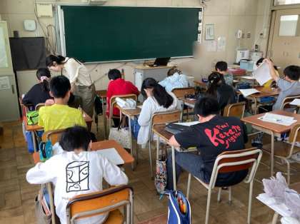 3組は算数「対称な図形」を学習しています。線対称と点対称のプリントをして理解の定着を図りました。2組は社会科「国の政治のしくみの選挙」を学習しています。選挙のしくみと税金の働きについて学びました。1組は教科外国語(英語)で、Who am I ?クイズをグループで出し合いました。