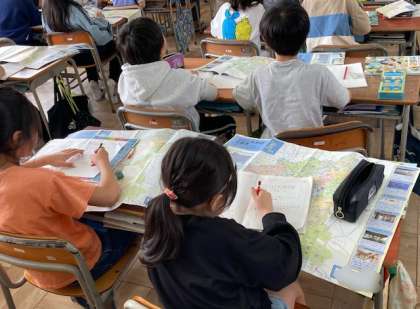3年の社会科は、専科の先生が担当して授業をしています。今日は「大阪市にはどのような場所があるか」を、大阪市の地図を使って学習しました。観光となっている大きな建物、交通、公共施設などを調べました。